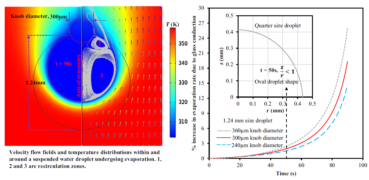 Detailed numerical analysis of evaporation of a micrometer water droplet suspended on a glass filament