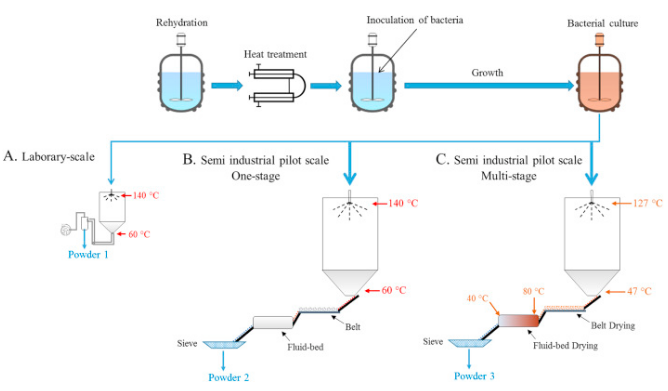 Spray-drying is expected to be a cost-efficient way to produce probiotic powders. Indeed, a novel simplified process was recently reported, using concentrated sweet whey (30 wt %) as a sole medium for both growth and spray drying of probiotics. The feasibility of scaling up this process was validated in the present work with a semi industrial pilot scale spray dryer. A multi-stage mild-conditions drying process, coupling spray-drying with belt drying and fluid-bed drying, was also applied in this work, in which the final probiotic survival was improved to approximately 100% (>109 CFU g−1). The change of probiotic viability in the powders was monitored during a 6-month storage, which indicated that storage temperature and moisture content of powders play crucial roles in the stability of probiotic powders. Moreover, spray-drying afforded a strain-dependent enhancement of bacterial tolerance in simulated intestinal fluid, in comparison with fresh cultures.