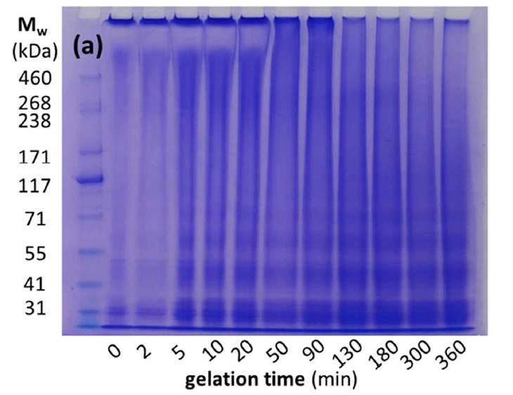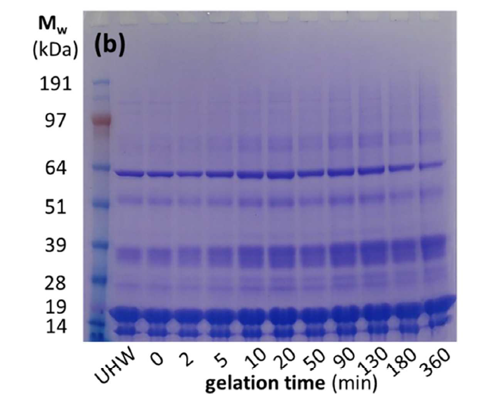 Fig 7. (a) Non-reducing and (b) reducing SDS-PAGE of solubilized solutions or gels during the alkali cold gelation of 9.45 wt% 2h WPI aggregates with NEM (RNEM/WPI = 0.5) at pH 11.84 and at different gelation times, and for unheated WPI (UHW)